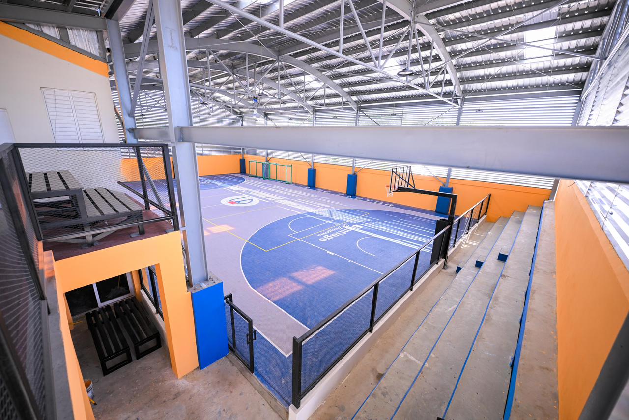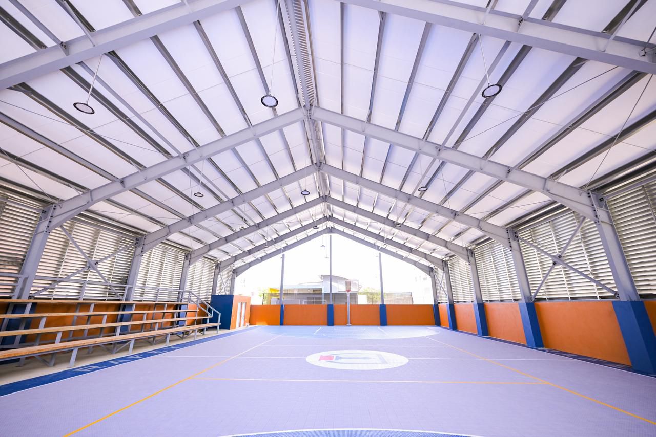 Este polideportivo, construido en un terreno de 980 metros cuadrados, cuenta con área de cancha con pisos, pintura y diseño especial para este tipo de estructuras, gradas en campo y en segundo nivel, en ambos extremos.