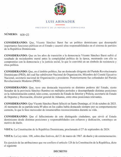 El presidente de la República, Luis Abinader, emitió el Decreto núm. 608-25, mediante el cual se declara día de duelo oficial el 18 de octubre del presente año, por el fallecimiento del destacado ciudadano dominicano Vicente Sánchez Baret.