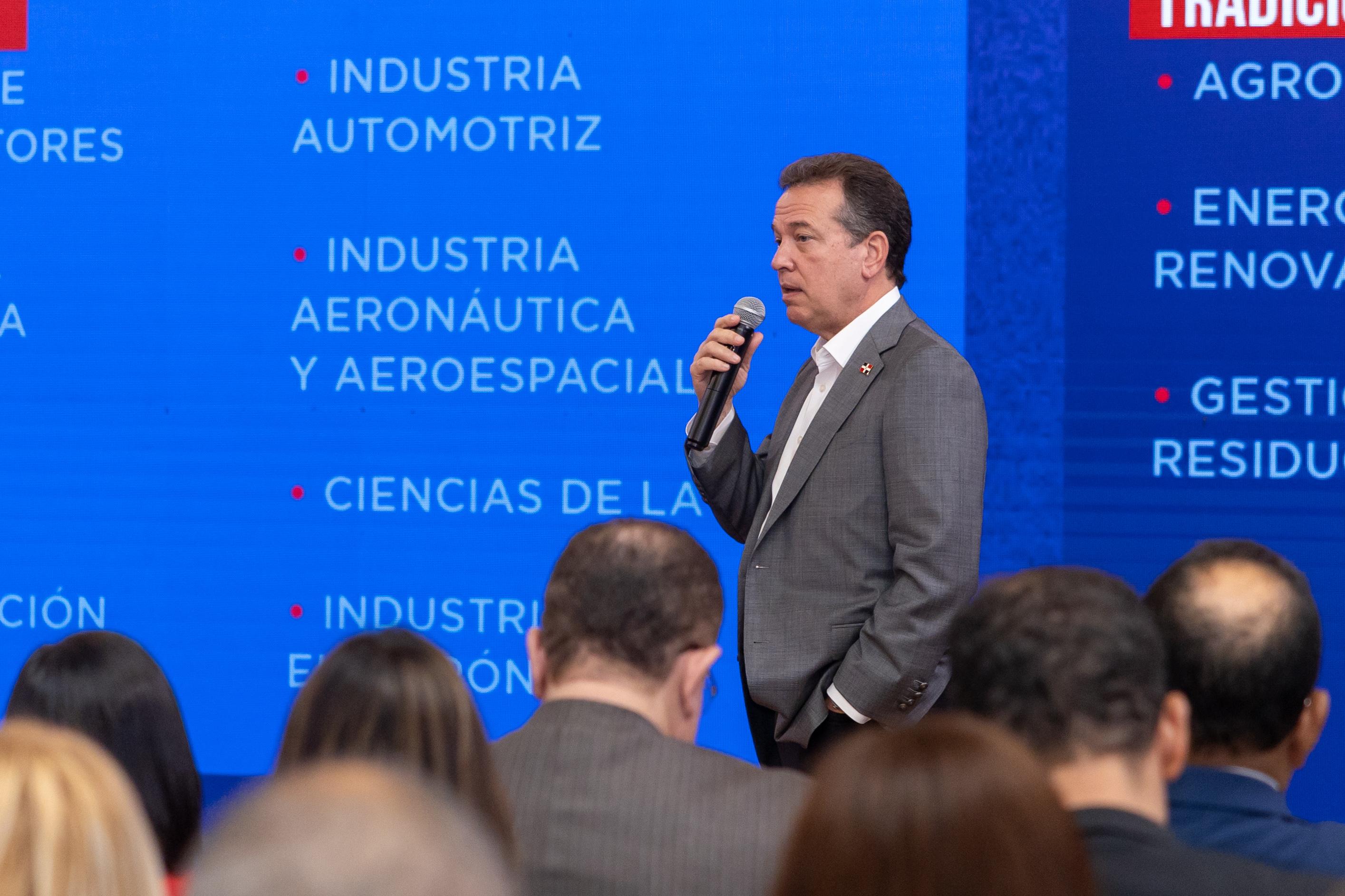 De su lado, el ministro de Industria, Comercio y Mipymes, Víctor “Ito” Bisonó, resaltó que el nuevo plan nacional de inversión promueve sectores innovadores como semiconductores, inteligencia artificial, industria aeronáutica y aeroespacial, automotriz, electrónica, centros logísticos y de distribución y ciencias de la vida, además de sectores tradicionales como agroindustria, energías renovables, gestión de residuos sólidos, minería, turismo, industria cinematográfica e inmobiliario.