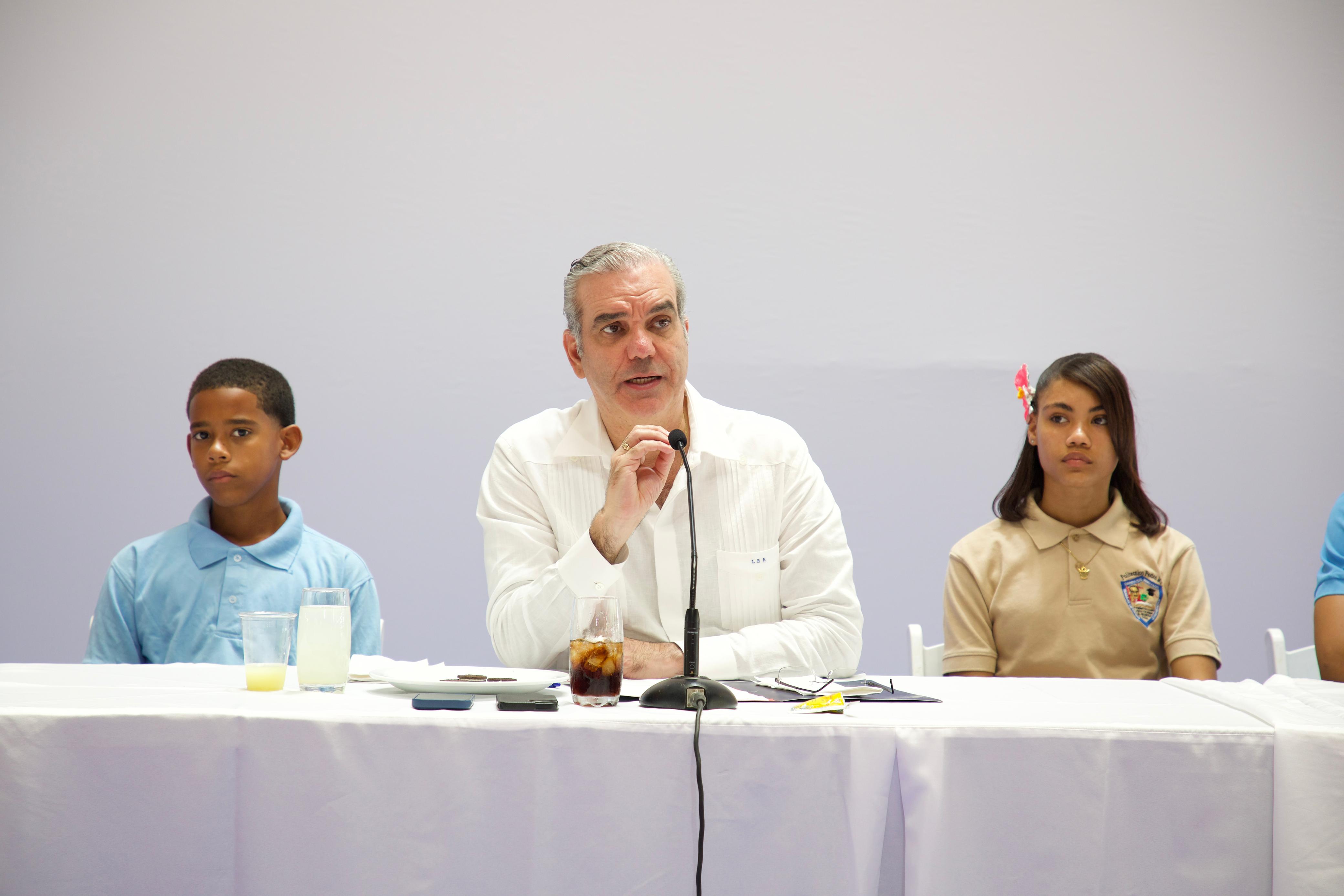 El presidente Abinader resaltó que su gestión está centrada en mejorar la infraestructura escolar mediante el equipamiento de laboratorios, la construcción de comedores y techados en los centros educativos, buscando elevar la calidad de la educación pública.