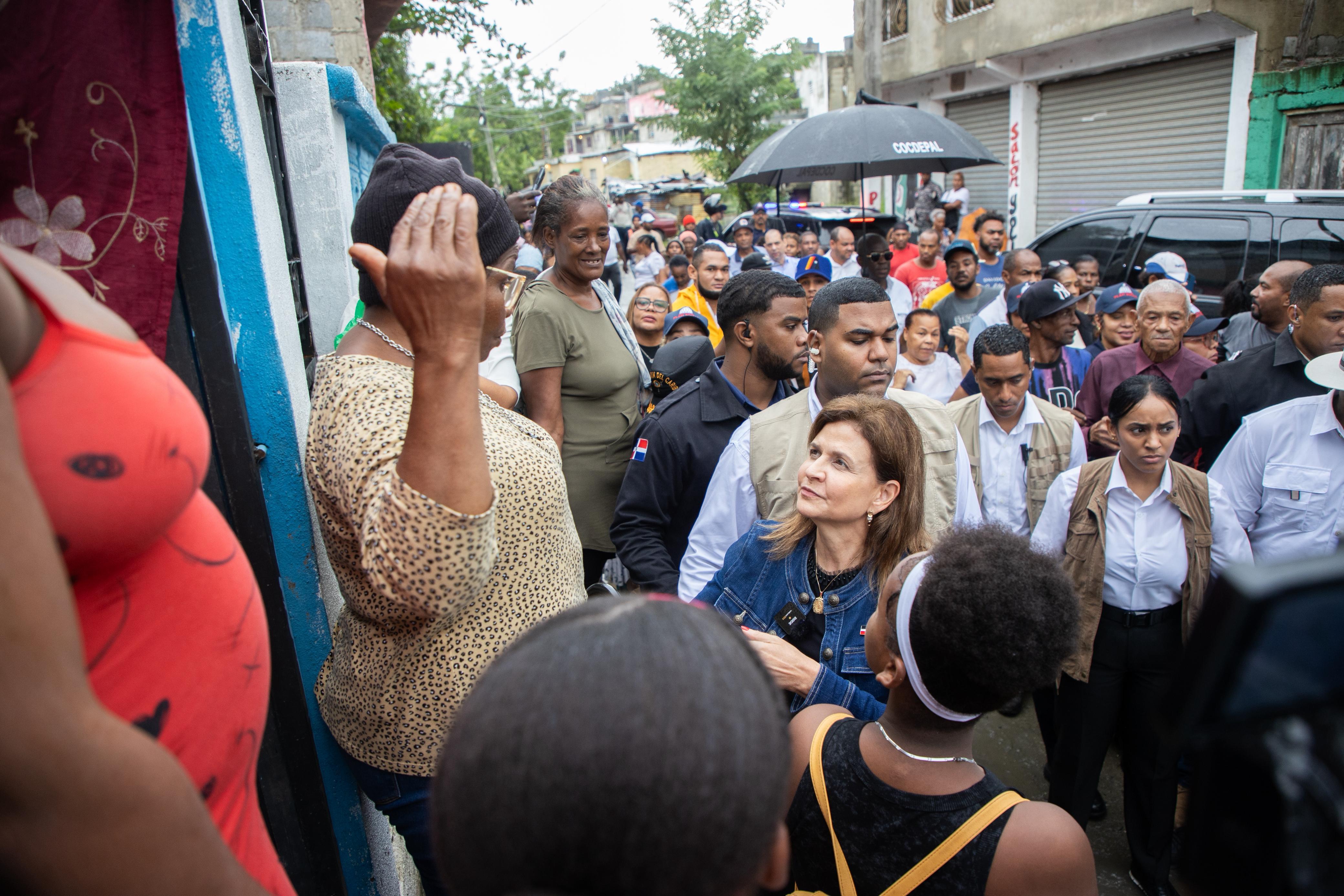 La vicepresidenta encabezó un recorrido por San Cristóbal y Santo Domingo Norte, donde supervisó daños y coordinó soluciones inmediatas tras el paso del fenómeno atmosférico Melissa