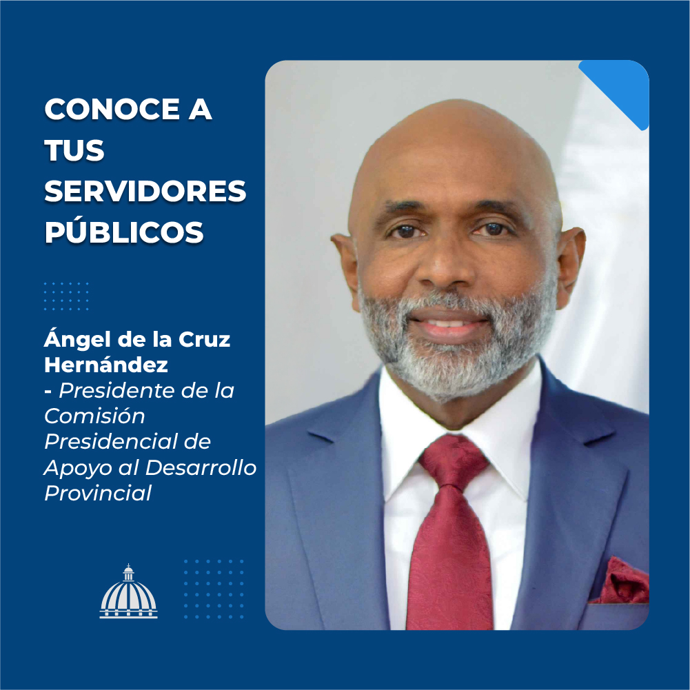 Ángel de la Cruz Hernández es el presidente de la Comisión Presidencial de Apoyo al Desarrollo Provincial. Es egresado de la carrera de derecho de la Universidad del Caribe, con maestría en derecho notarial de la misma institución académica y formación especializada en administración pública.