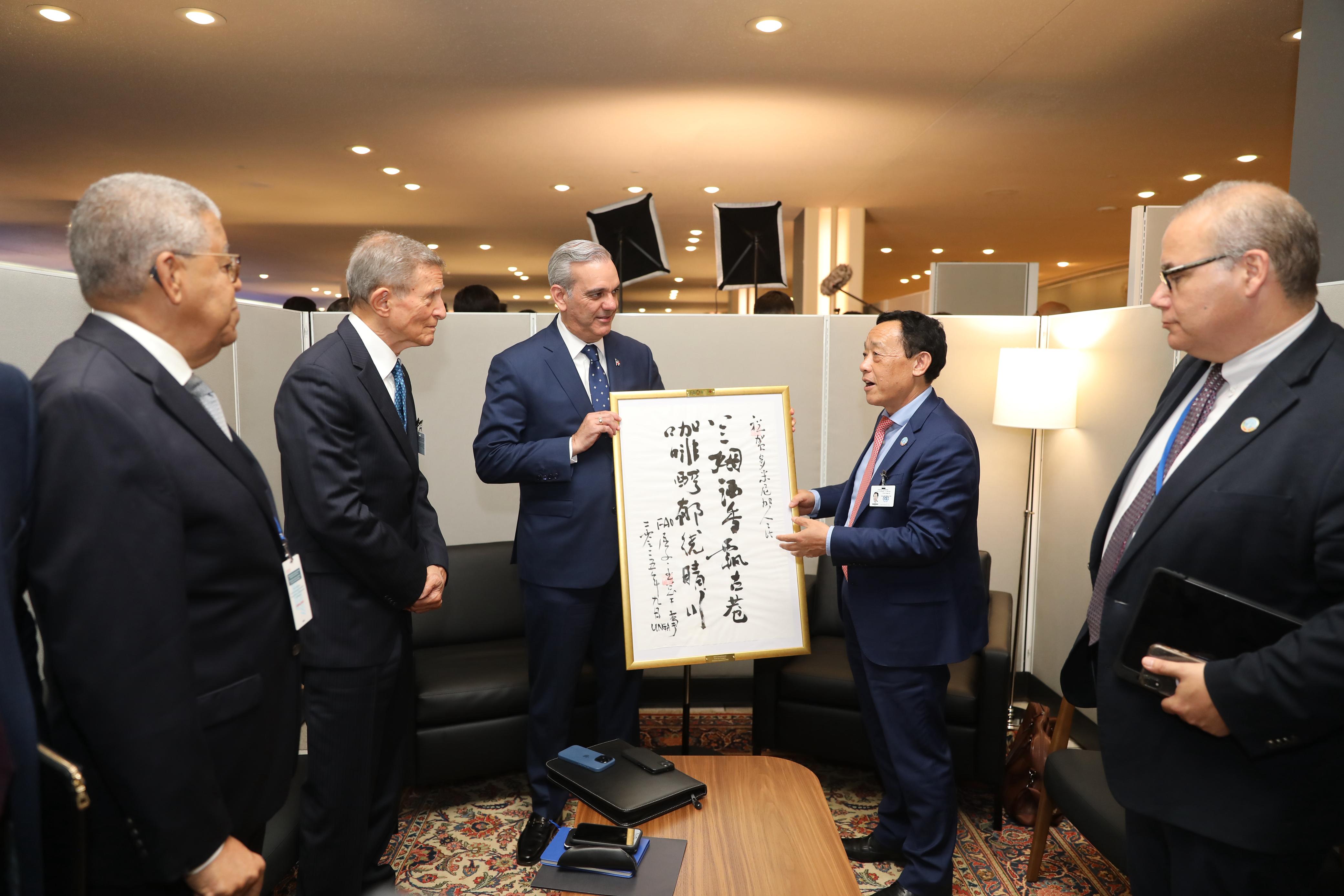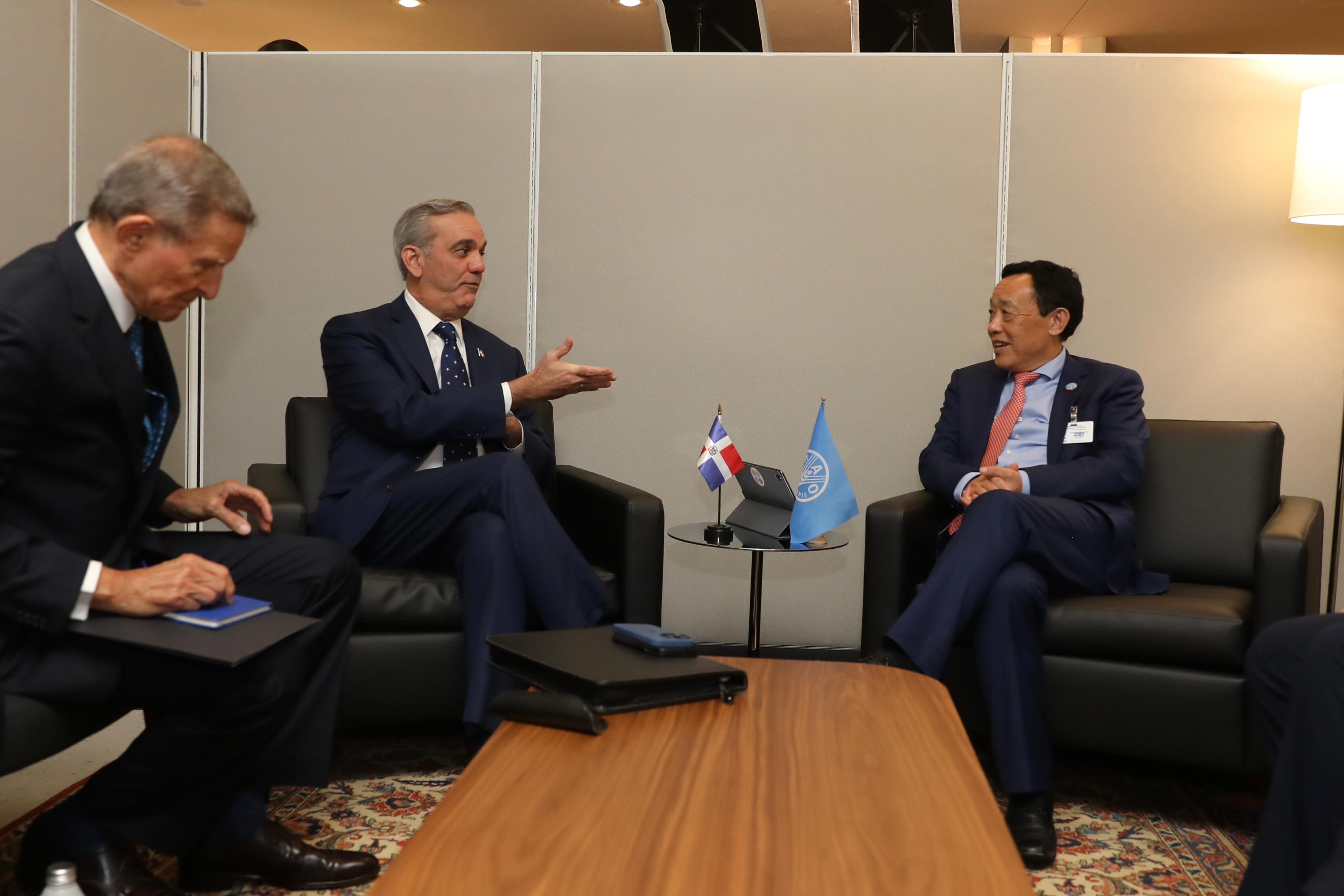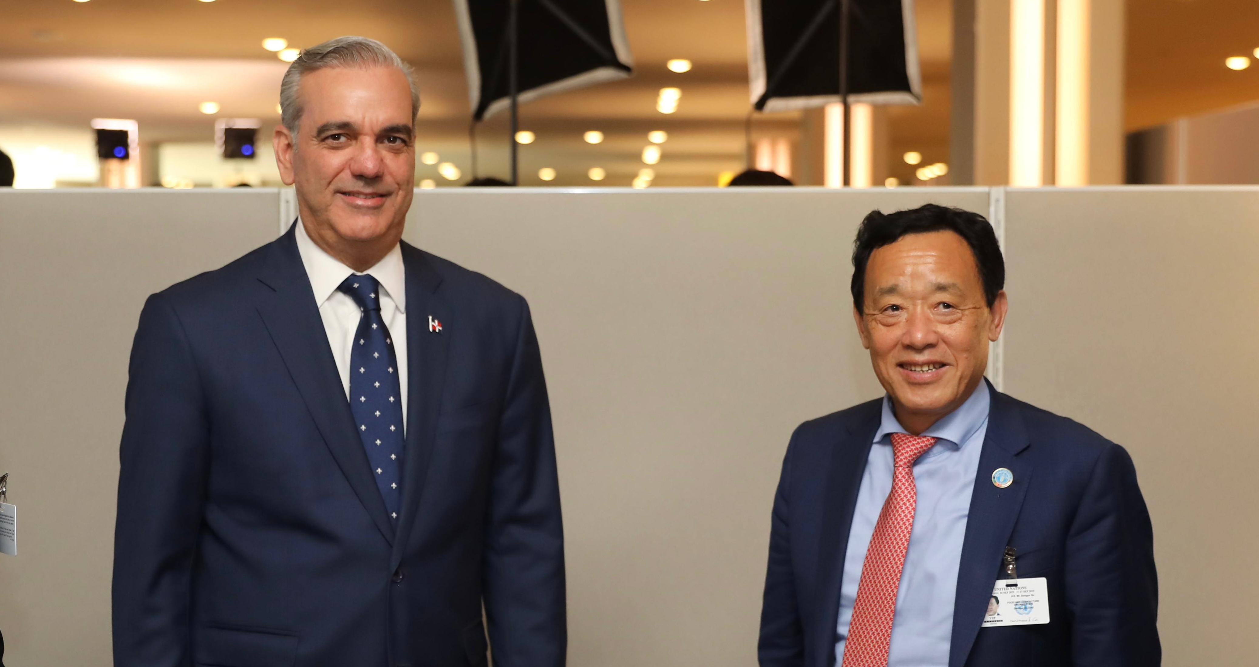 Nueva York.- El presidente Luis Abinader sostuvo este martes una reunión bilateral con el director general de la Organización de las Naciones Unidas para la Alimentación y la Agricultura (FAO), Qu Dongyu, en la sede de las Naciones Unidas.